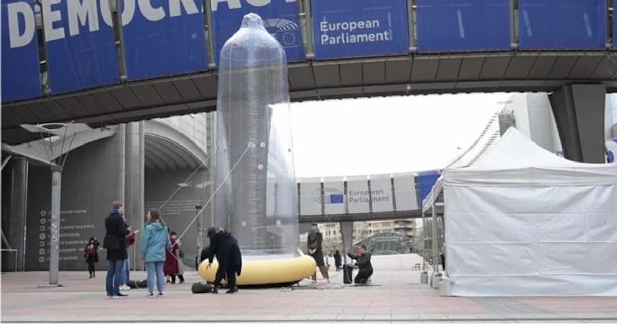 Group presents giant inflatable condom in front of EU Parliament
