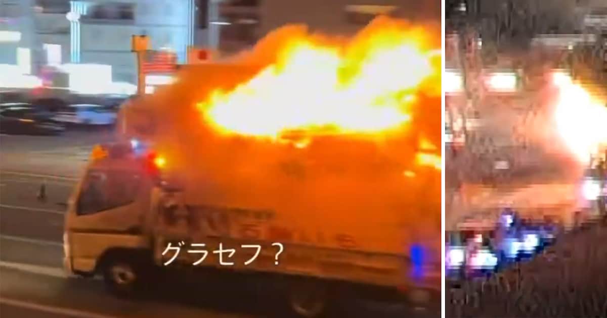 The vehicle drove through the streets of Kumamoto City on Thursday evening – including blazing flames, loud disco music and flashing lights. The incident was filmed by numerous passers-by.